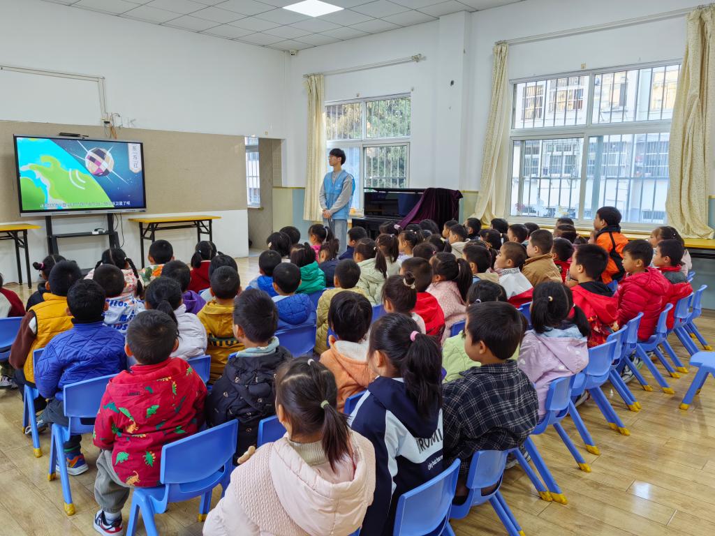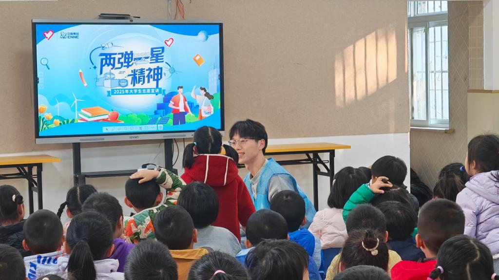 最后,志愿者播放《中国“两弹一星”成长记》视频短片,展示原子弹、导弹、人造卫星等重大科技成果的诞生时间,以及它们对中国的意义。活动现场不时响起孩子们阵阵稚嫩的掌声和惊叹声,他们眼中闪烁着敬佩与向往的光芒。互动提问环节中,孩子们的回答既充满童真,又流露出坚定的情感。宣讲员王晨乐感叹道:“看到孩子们眼里闪烁的光芒,我们觉得所有准备都值得,希望‘两弹一星’精神能在他们心中深深扎根。”