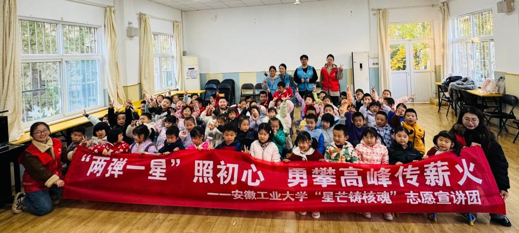 8名师生党员、发展对象、入党积极分子走进安工大幼儿园的多媒体报告厅,面向所有大班幼儿开展“听科学家故事,传‘两弹一星’精神”主题宣讲活动。志愿者们以童趣化的动画、视频短片为载体,结合互动提问,为近70名幼儿讲述钱学森、邓稼先等科学家的感人事迹及新中国“两弹一星”事业的发展历程。