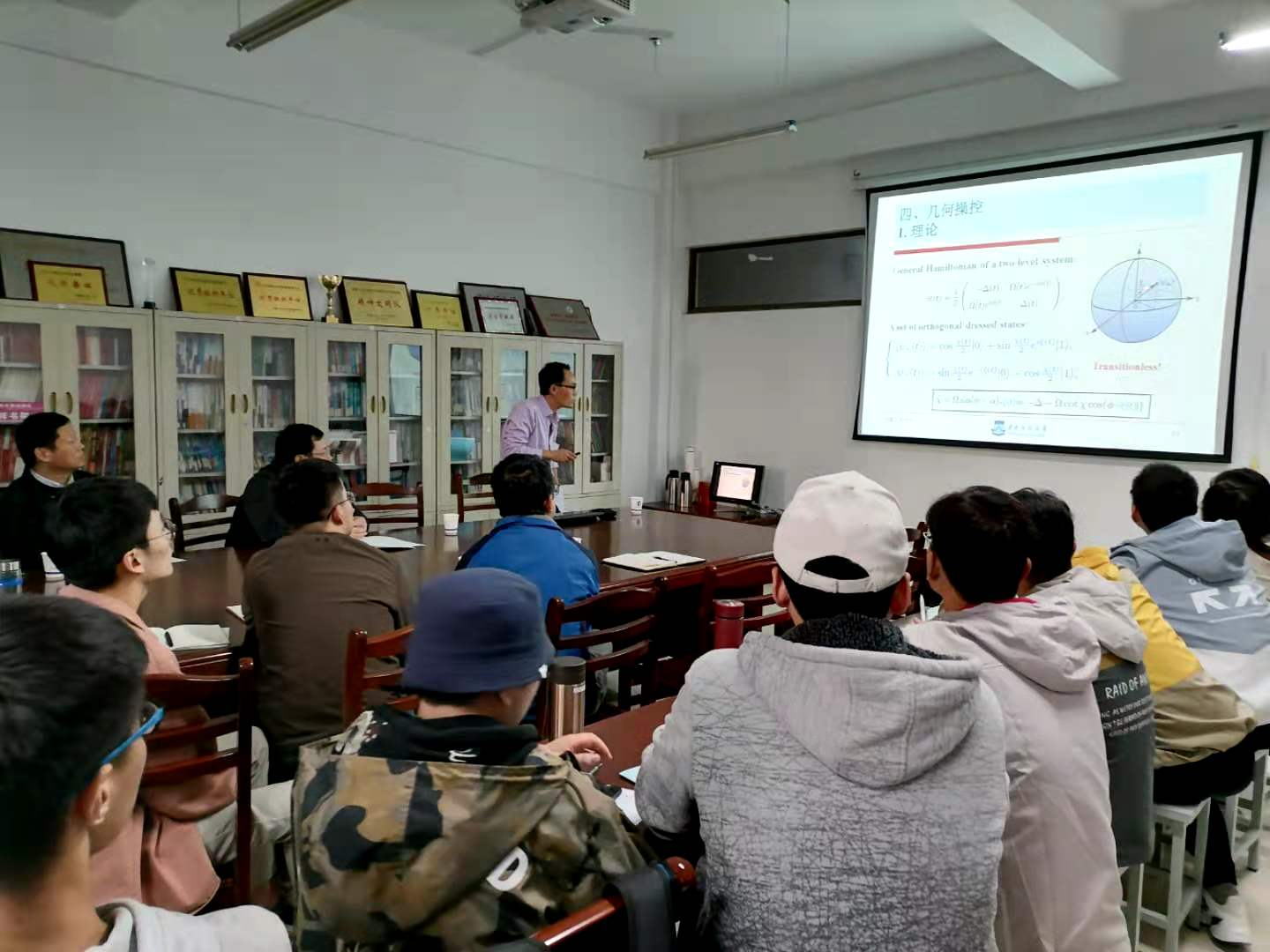 薛正远教授首先介绍了国家基金申报、实验室建设、论文投稿的注意事项和经验,随后作了《时间优化的几何量子计算》的学术报告。学术报告深入浅出地讲解了量子计算研究的意义、要求和实现路径,介绍了几何量子计算的最新进展和研究成果。参加学术交流的教师和研究生对自己感兴趣的问题与薛教授进行了深入交流探讨。