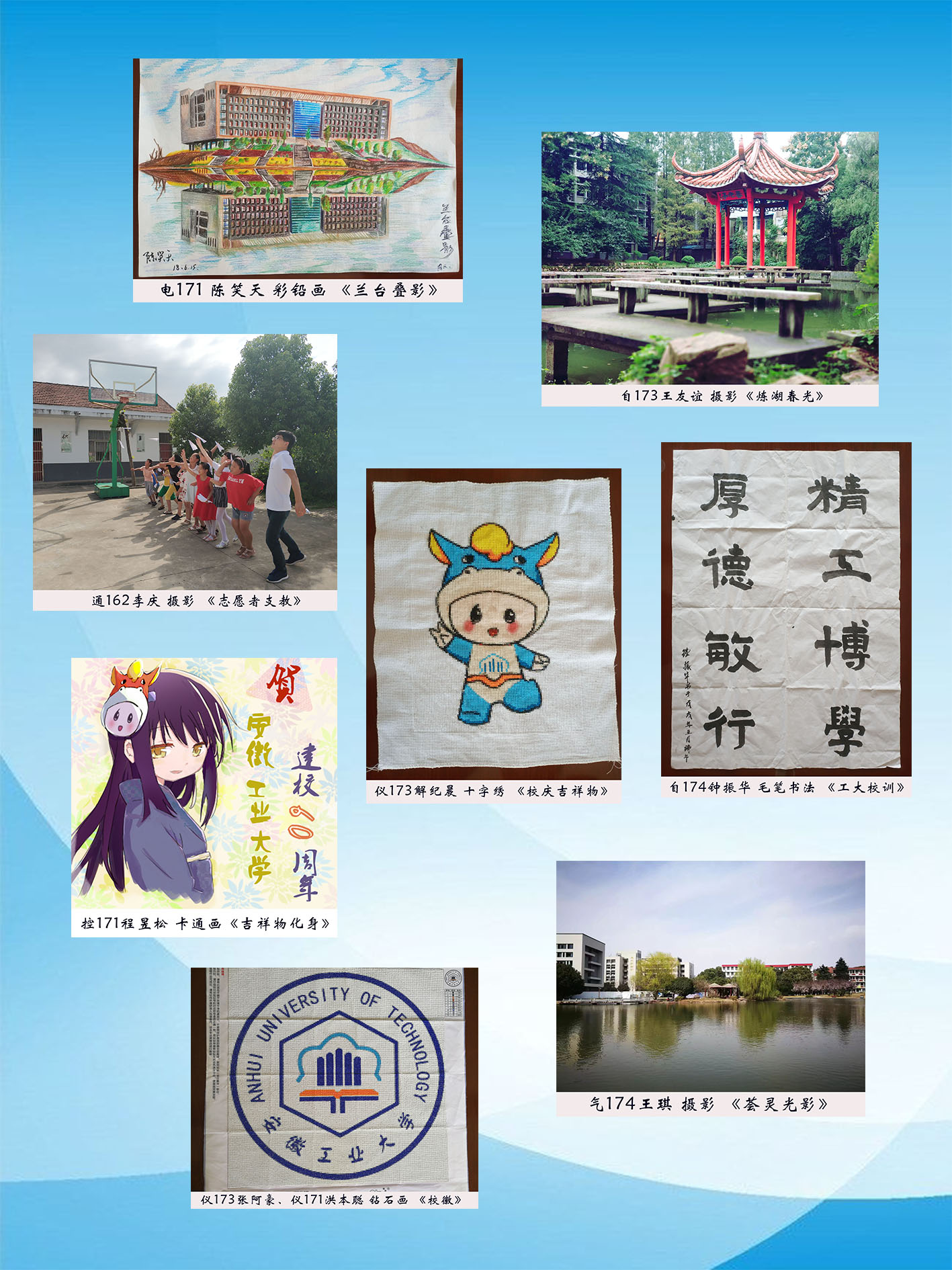 院团委学生会负责组织各年级各班级精心策划、广泛动员,深入挖掘有艺术才能的学生,充分调动大家参与本次活动的积极性、主动性、创造性。各年级学生踊跃参与、认真准备,以摄影、彩铅画、十字绣、钻石画、卡通画、书法、剪纸等多种艺术形式展示学校校徽、校训、校庆吉祥物,呈现校园风景、人物和故事。一幅幅倾注了电气学子热情和心血的作品,记录着大家的工大印象,彰显了大家的青春风采。从征集到的100多幅作品中,哔咔漫画