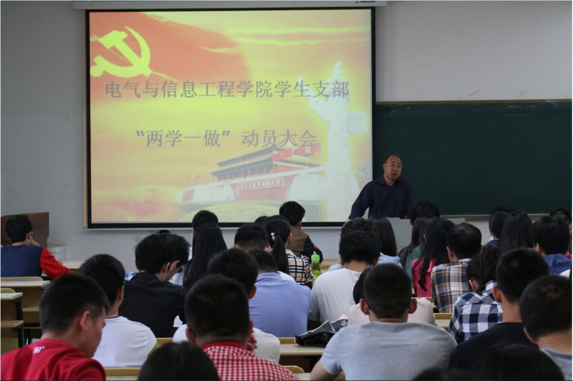 郭宏做动员讲话。他指出,“两学一做”是继“三严三实”专题教育之后,深化党内教育的又一次重要实践,也是推动学习教育从“关键少数”向全体党员拓展,从集中性教育活动向经常性教育延伸的重要举措。“两学一做”主要是学习党章党规、学习习总书记系列讲话精神、做合格党员,而作为学生党员,必须严格要求自己,在学生群体中树立榜样。他对全体学生党员提出要求:夯实基础、增强政治意识、大局意识;学做并举、发挥先锋带头作用;坚持理想信念,牢记誓词、不忘初心。