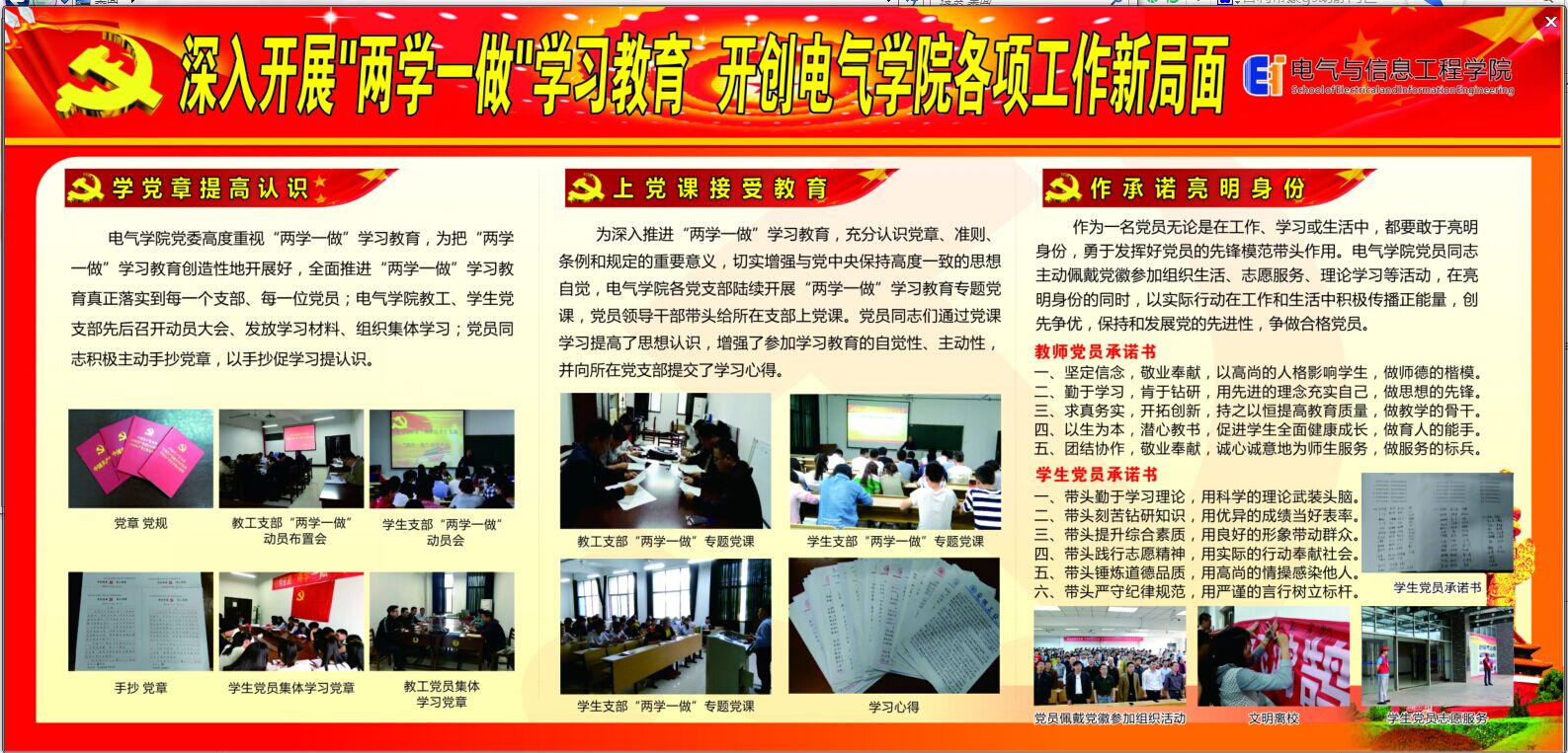 各项工作新局面”主题展板,在教学区域和学生宿舍展览。在党员活动室的墙上,鲜红的党旗挂起来,内容丰富的“两学一做”规章及制度贴起来。在日常的党员活动中,鲜艳的党徽戴起来。除此之外,建立微信群、QQ交流群,方便党员通过线上模式安排学习教育计划。通过多形式、多角度的宣传,“两学一做”深入人心。