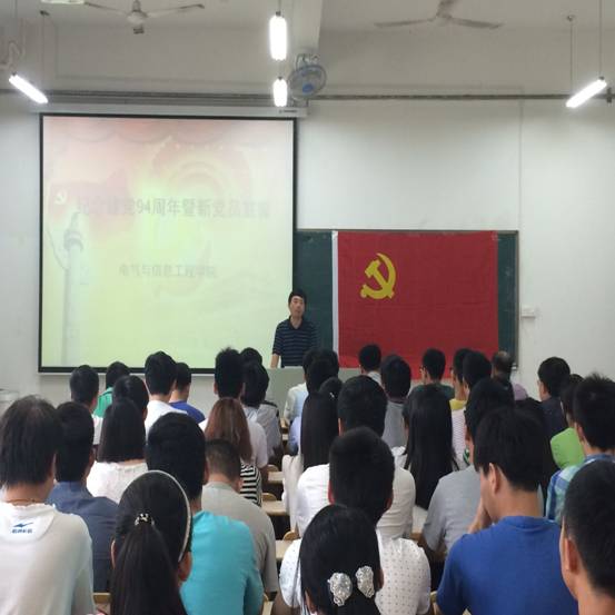 学生支部党员发展情况,通报了新党员名单。电子通信学生支部新党员电121班方世玉同学作为新党员代表发言,他代表所有的新党员向党组织表达了提升自己思想政治修养和发挥先锋模范作用的决心。随后,在自动化学生支部党员自123班金豪杰同学的带领下,51名新党员面对鲜红的党旗进行入党宣誓,到会的老党员重温入党誓词。短短的一百多字,是党员对组织最初的,也是一生的承诺。