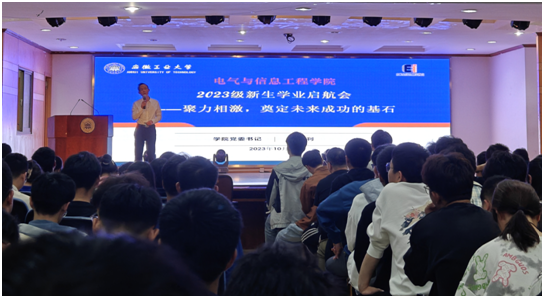 会上,丁忠利围绕2023级新生在德智体美劳全面发展的总体目标,结合优秀校友、在校同学的典型示范和学习榜样,突出学生在校期间的学习生活规律和特点,以实力、动力、压力和努力“四力齐发”的育人思路为出发点,为2023级新生们讲述了在大学期间持续加强思想、学业、体育、人文、创新、安全纪律等六大方面的淬炼、历练和锻炼的总体思路与具体途径,让全体新生对未来四年的学习生活有了更加深刻的认识。
