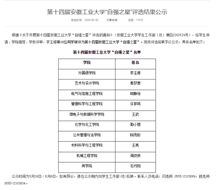学子胡静怡获2025年安徽工业大学第十四届“自强之星”荣誉称号。