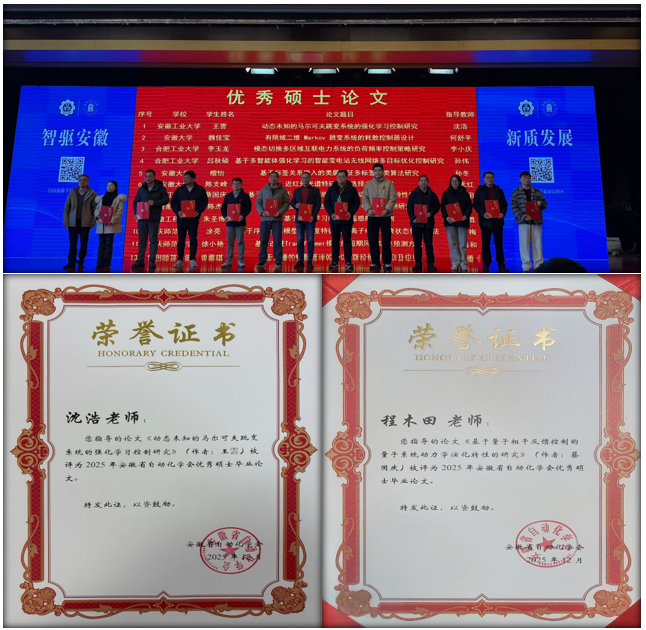 喜获安徽省自动化学会优秀硕士毕业论文奖、优秀本科毕业论文奖以及优秀青年人才奖。其中,硕士研究生王雲撰写的《动态未知的马尔科夫跳变系统的强化学习控制研究》(指导教师:沈浩)和蔡国庆撰写的《基于量子相干反馈控制的量子系统动力学演化特性的研究》(指导教师:程木田)获得优秀硕士毕业论文奖;本科生王文泽撰写的《基于代理模型的激波风洞膜片选型方法研究》(指导教师:费习宏)和孙泽林撰写的《基于光纤光栅的动态数字手势智能识别研究》(指导教师:钱牧云)获得优秀本科毕业论文奖;哔咔漫画