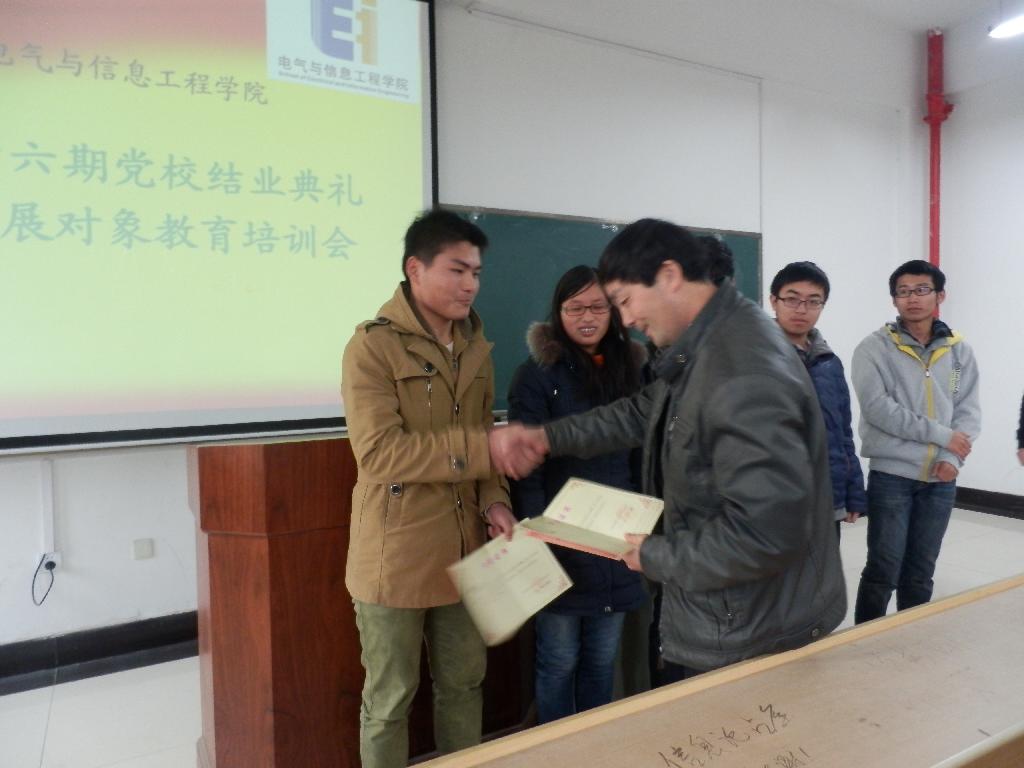 郭宏发表讲话,首先对同学们能够参加党校学习表示祝贺,对2014年的发展对象表示祝贺,他希望同学们继续坚持学习党的理论知识,在日常学习、生活、工作中要严格要求自己,虚心向老党员学习,积极向党组织靠拢,按时向党组织递交思想汇报,发展对象要主动向培养人当面汇报思想动态。仰望星空,脚踏实地,创先争优,勤勉励志,从学习、工作、实践等各方面做同学们的榜样和排头兵,以实际行动争取早日加入中国共产党。(尚全 孔洋波)