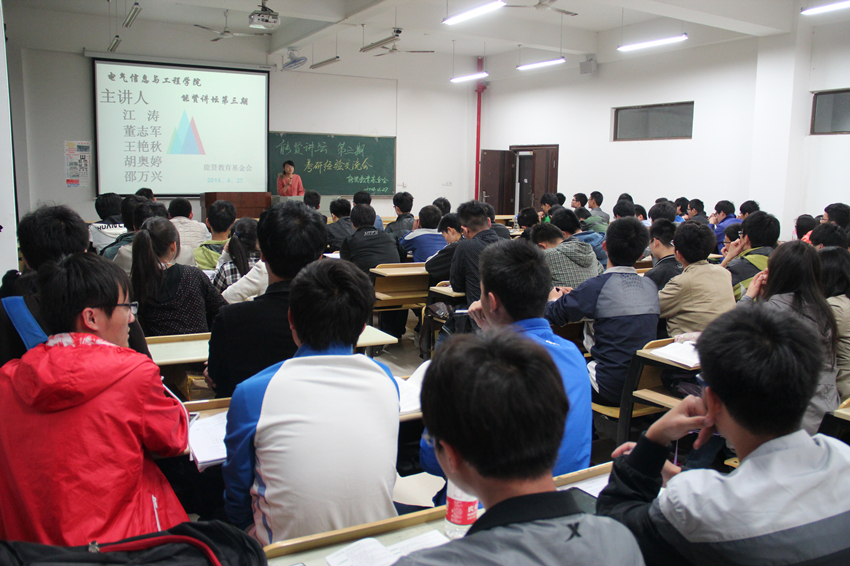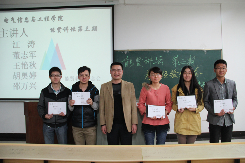 本次讲坛为招标课题,开讲之前一周,尚老师已提前联系了部分考研成功的学长和学姐,确定了电气专业江涛、董志军、王艳秋,电子专业胡奥亭,通信专业邵万心等五位主讲人,邀请他们为同专业的学弟学妹们进行专业学习和考研交流。