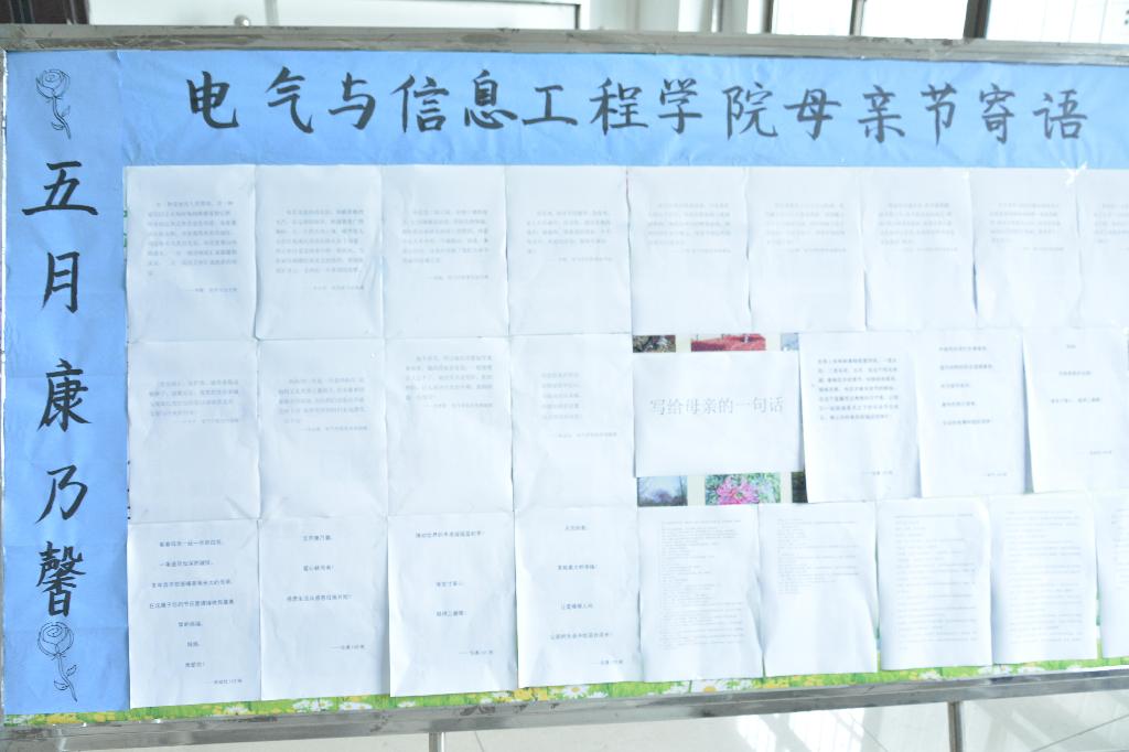各年级的同学各显才能,通过给母亲的一封信,母亲节寄语,精美的祝福卡片以及“情浓五月天,感恩母亲节”集体签名等活动表达大家对母亲的深深祝福和思念,一系列活动也让工大的校园里弥漫了满满的温暖和感动。