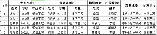 通信工程、电子信息等专业的学子们踊跃参赛,同学们在比赛中以扎实的理论基础知识、过硬的动手实践能力和密切的团队合作精神,在专业老师们的精心指导下,共荣获全国大赛三等奖1项、安徽赛区一等奖1项、二等奖1项和三等奖2项。