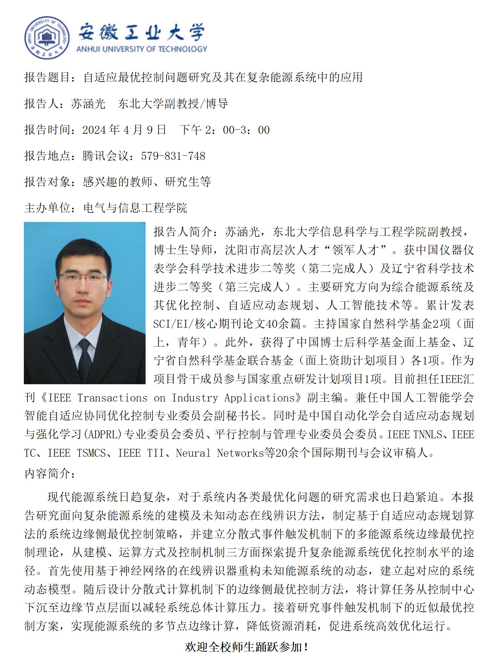 “谦之”学术讲坛之七十八-自适应最优控制问题研究及其在复杂能源系统中的应用