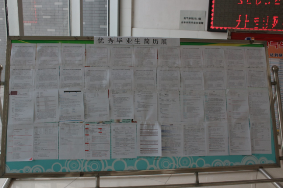 在徐悦、印路路两位辅导员的组织安排下,电气楼一楼大厅竖起两块精心准备的展板,每块展板上都展示着之前毕业的多位优秀毕业生的简历。这些简历上非常详细地展示出哔咔漫画