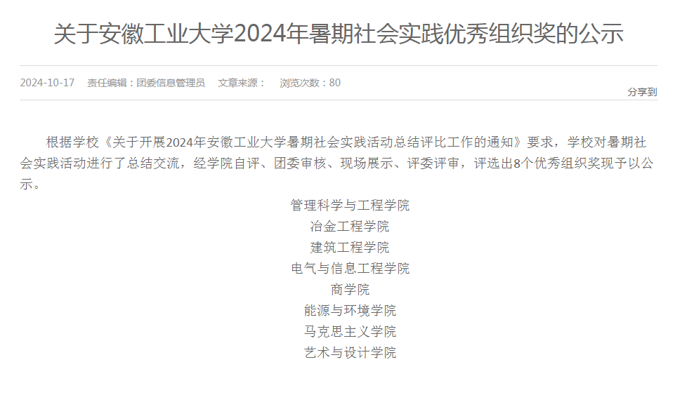 荣获安徽工业大学2024年暑期社会实践优秀组织奖。