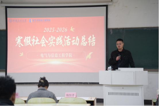 成果展示环节,杨恒基通过PPT、视频等形式,向与会同学集中展示了本次寒假社会实践的优秀成果。他从“我把工大带回家乡”招生宣讲的精彩瞬间、乡情民情观察的调研纪实、助力家乡发展的志愿服务现场,到学风建设与思想领航的21天阅读打卡记录,逐一呈现了同学们在实践中的生动画面与深刻感悟。一幅幅照片、一段段视频,直观展现了电气学子深入基层、服务家乡的青春风采,让在场同学深受触动。