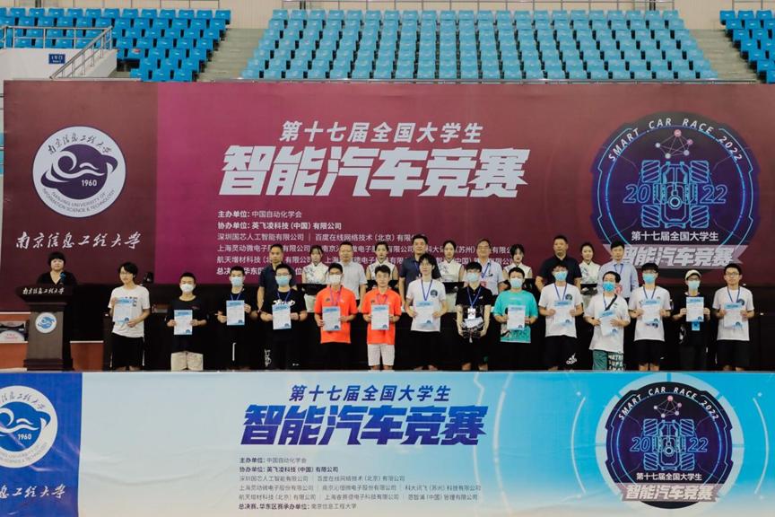 参加了其中五个组别比赛,其中:祝石林、杨净淳同学在智能视觉组中荣获国家一等奖(指导老师:李丹);权程鹏、陈亮、李天承、李恒、谢聪同学在多车编队中荣获国家一等奖(指导老师:刘一帆);张乾坤、齐瑜、田峰坤在无线充电组中荣获国家一等奖(指导老师:钱牧云,杨红伟);童祺越、闫聪、胡杰同学在平衡单车组中荣获国家二等奖(指导老师:汪婧);朱弘泽、徐劭、杨帅琦同学在平衡信标组中荣获国家二等奖(指导老师:刘一帆)。